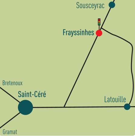 Frayssinhes se situe sur la route Saint-Céré -Souveyrac- Aurillac, à 6 km de Saint Céré et à 10 km de Souceyrac. (25 km de Gramat, 22 km de Beaulieu sur Dordogne, 21 km de Latronquière)